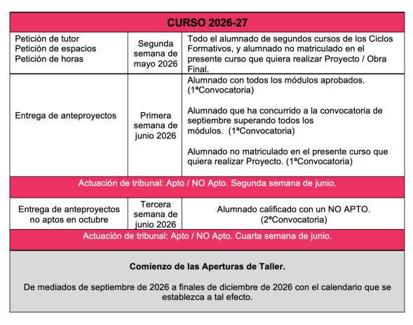CALENDARIO OBRA FINAL / PROYECTO FINAL 2026-2027